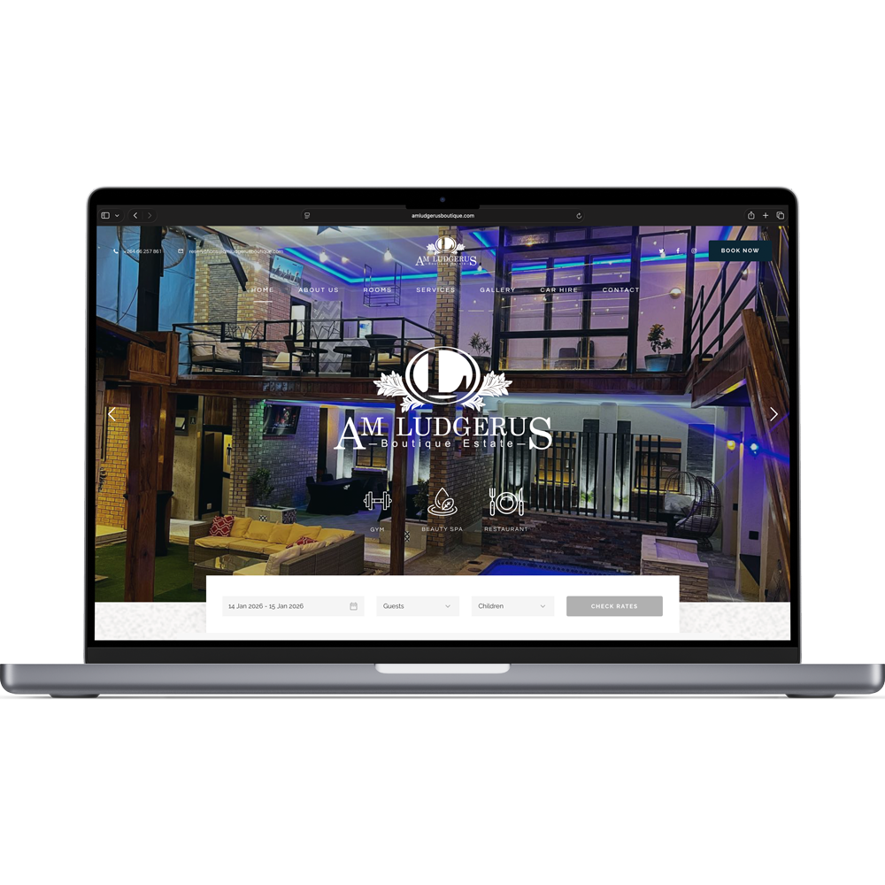 The AM Ludgerus Boutique Estate website presents a professional hospitality platform for a luxury boutique guesthouse in Rundu, Namibia, highlighting rooms, amenities (like gym, spa, restaurant, pool, and conference facilities), and services. It features clear navigation with sections for rooms, services, gallery, and contact details, along with integrated booking functionality via NightsBridge to facilitate secure online reservations. The design emphasizes visual appeal, usability, and mobile responsiveness to support guest engagement and conversion.
