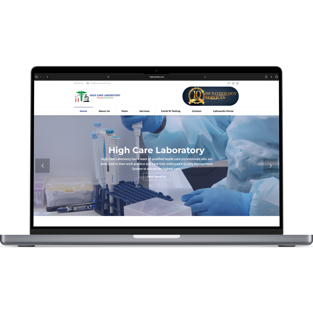 The High Care Laboratory website is a professional medical diagnostic platform for a private pathology service provider in Namibia. It highlights the organisation’s mission, comprehensive laboratory services (including haematology, molecular diagnostics, clinical chemistry, immunochemistry, and microbiology), COVID‑19 testing options, and expert team information. The site features intuitive navigation, a clean responsive design, and clear contact pathways, making it easy for patients and healthcare partners to access information and request services.